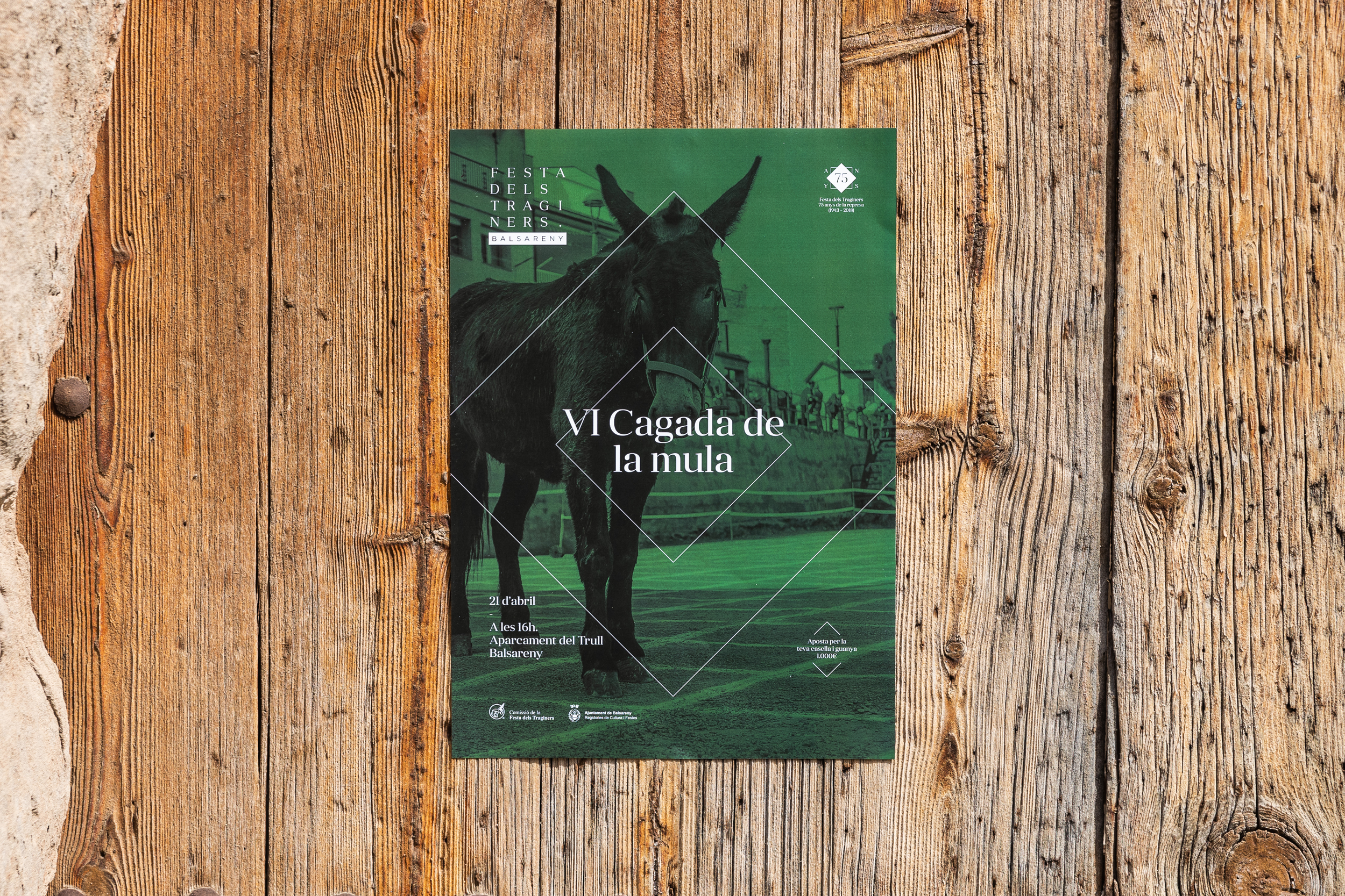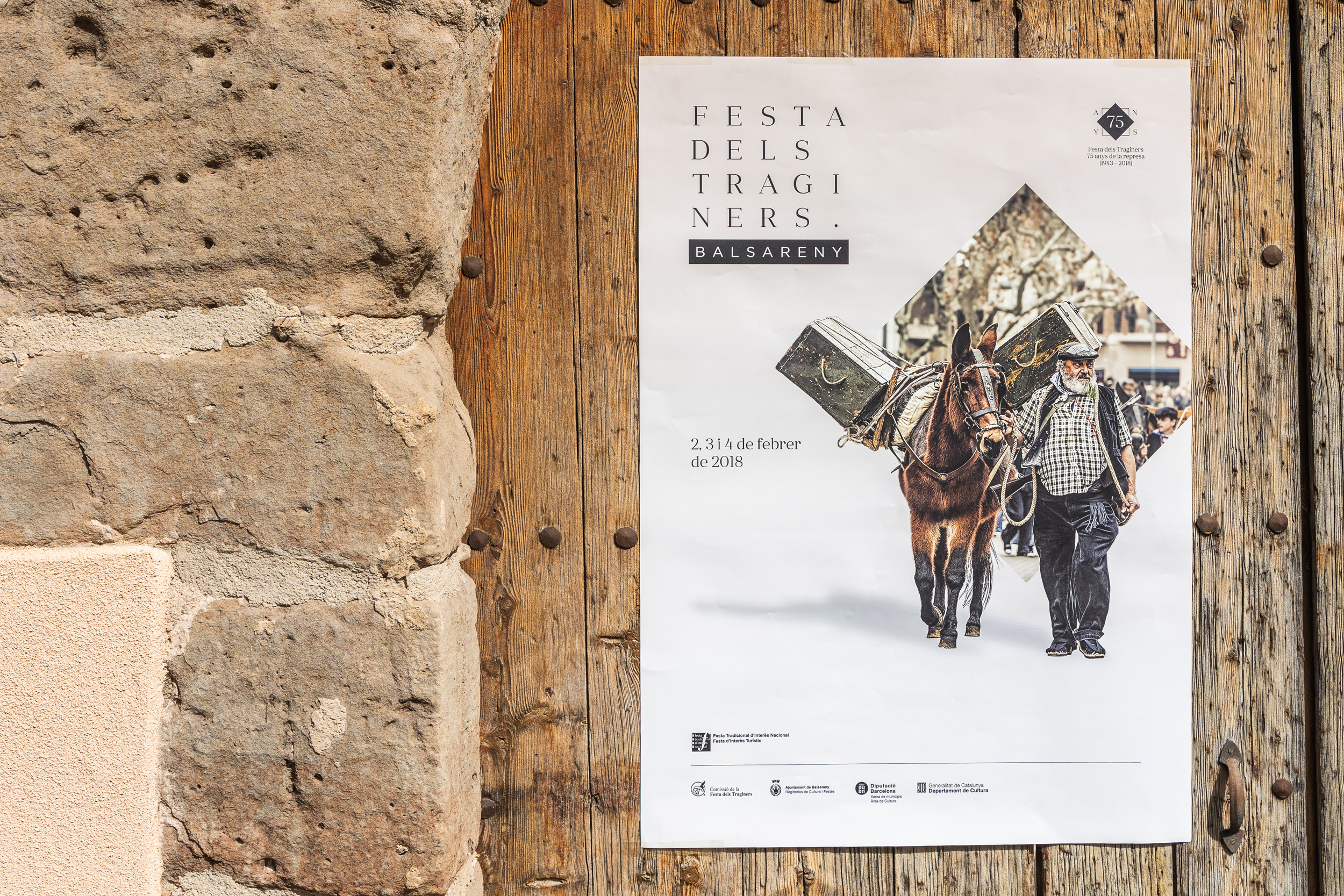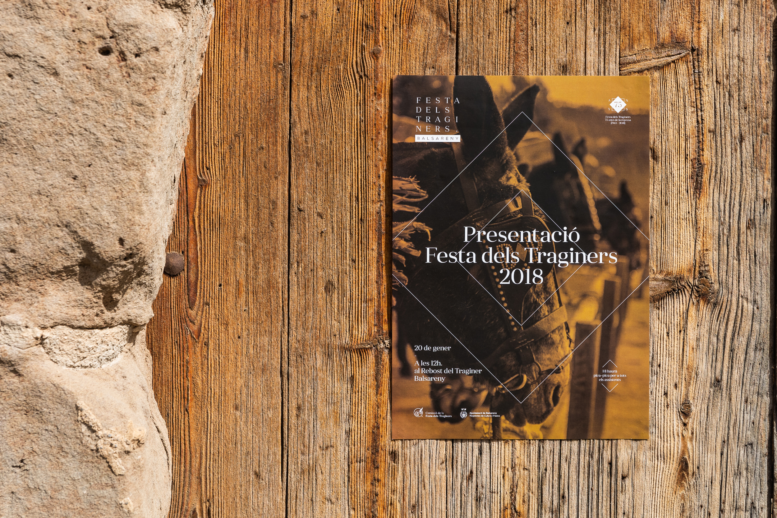 En el pueblo de Balsareny se celebra cada año la Festa dels Traginers. Un reconocimiento a la figura del «traginer» que hacía posible el transporte de mercancías y daba vida a los lugares más inaccesibles, uniendo todo tipo de pueblos y ciudades. Documentada desde el siglo XIX, restaurada en 1943 y declarada Fiesta de Interés Turístico Nacional, esta fiesta requería un salto a nivel gráfico. En primer lugar, se definió una tipografía y código visual que, a través de la geometría, permitía una amplia colección de piezas de comunicación. A partir de aquí generamos una cabecera versátil que actuara en todos los soportes y una serie de iconos para los diferentes espacios o actos de la fiesta. Además, coincidiendo con el 75 aniversario de la reanudación, se creó un logo conmemorativo que también acompañara a la comunicación.